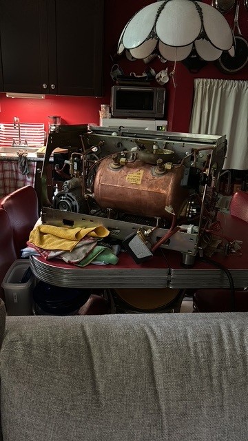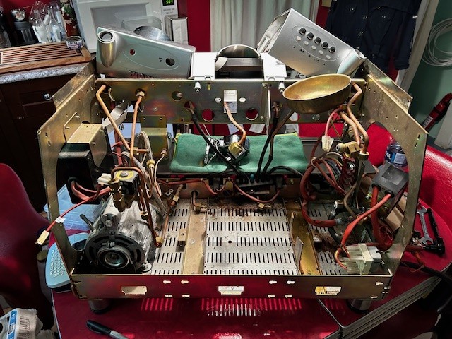 It took about a year for me to take apart and rebuild this machine. I had never done anything like this before and so had to research and dig into online resources to determine how to obtain approved parts and how to diagnose certain faults. My fascination with the hydraulics and electromechanical systems of a commercial espresso machine drove me to apply comprehensive research in order to properly rebuild this unit. I also custom build the wooden cart to ensure it was able to support the hefty weight of the machine including triangular bracings on all 4 sides as well as 50lb weight tolerance castors so that it was easily manipulated and moved when more repairs are needed.